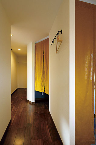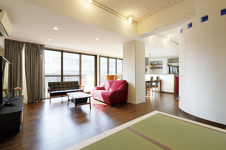 地中海の青のベネチアングラスをはめ込んだアール壁のあるLDKは砂漆喰塗りの壁、硅砂を含んだ塗料を吹き付けた天井、ウォールナット床材、タイル貼りのRC柱など素材感のあるインテリアに。