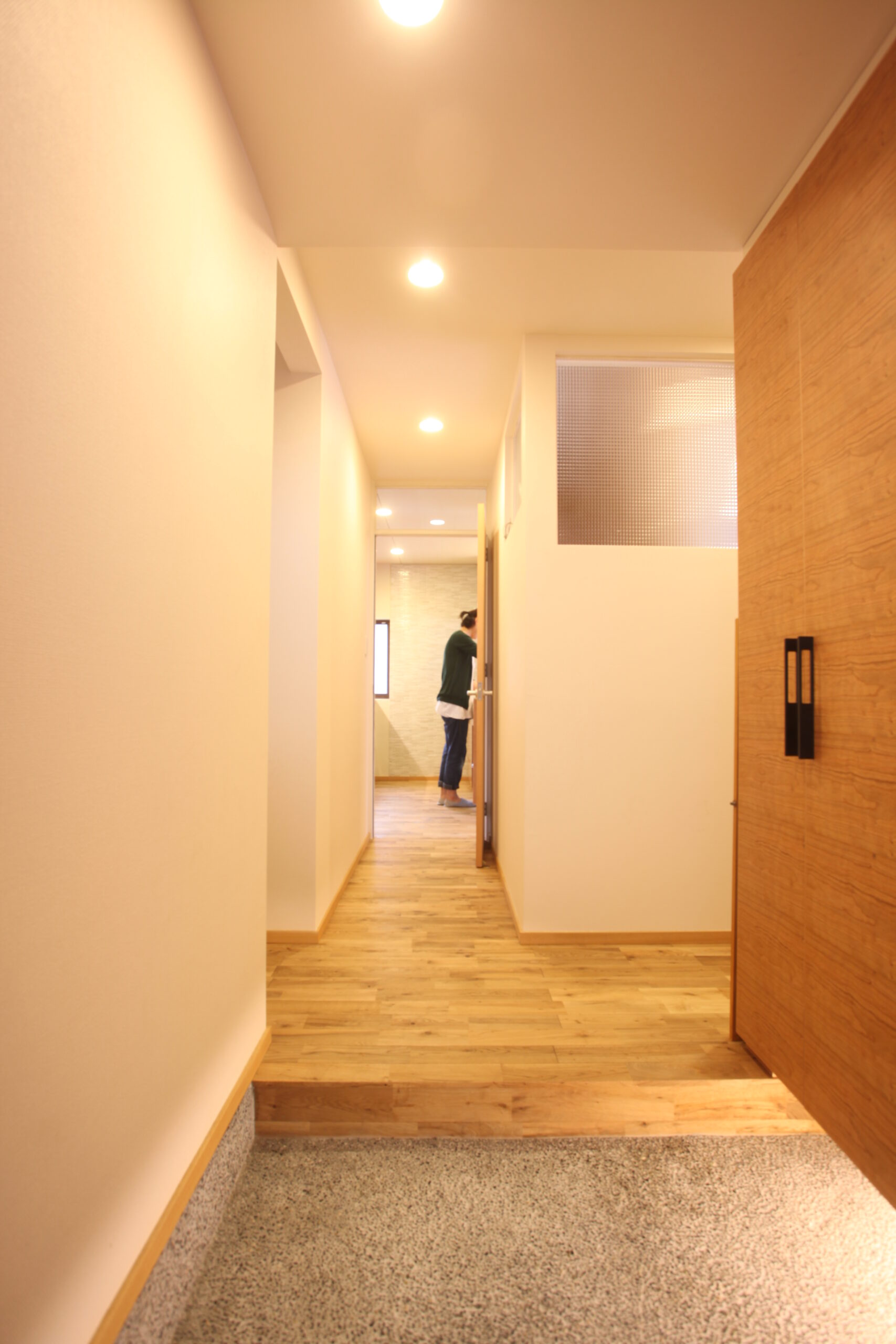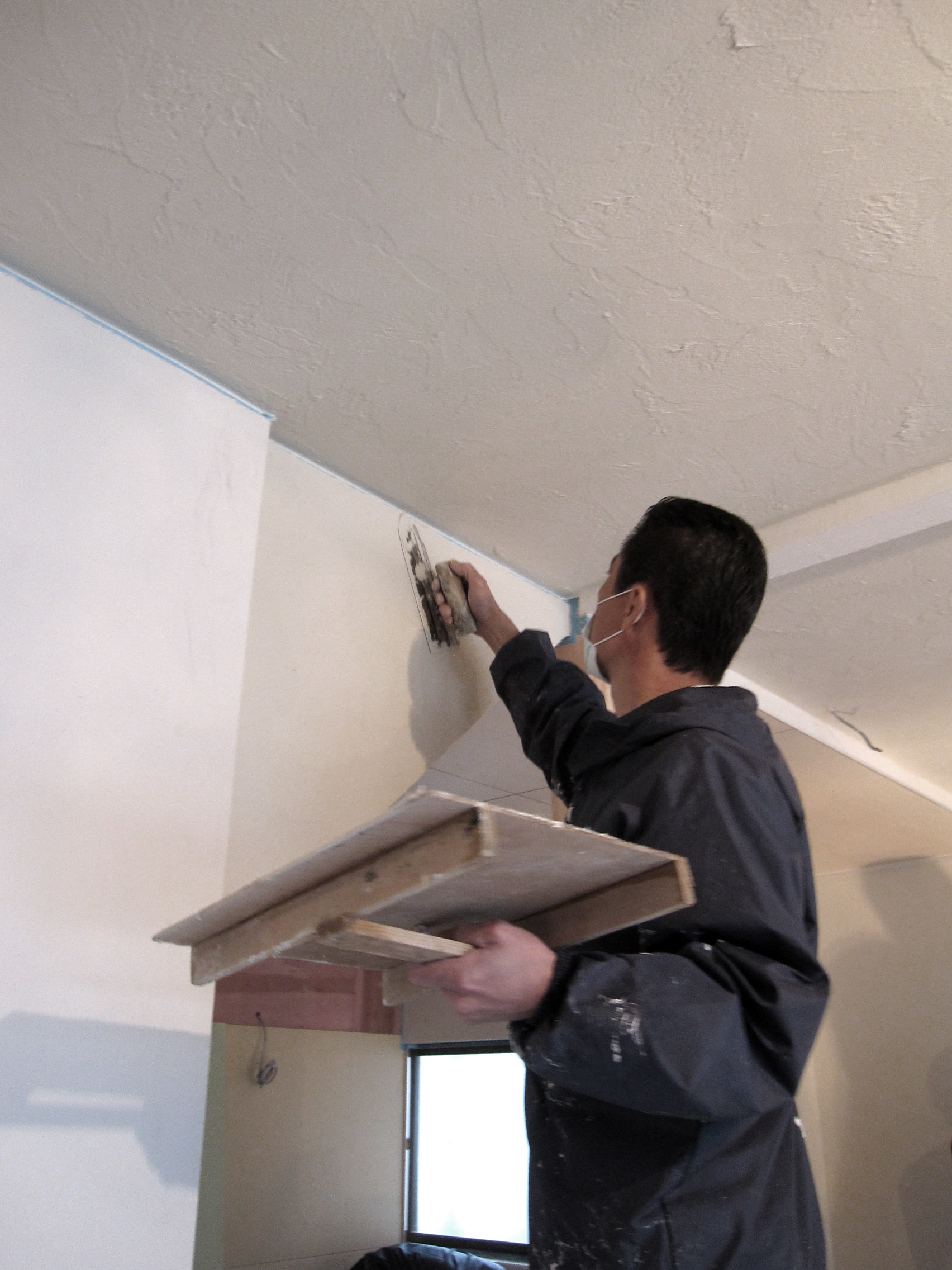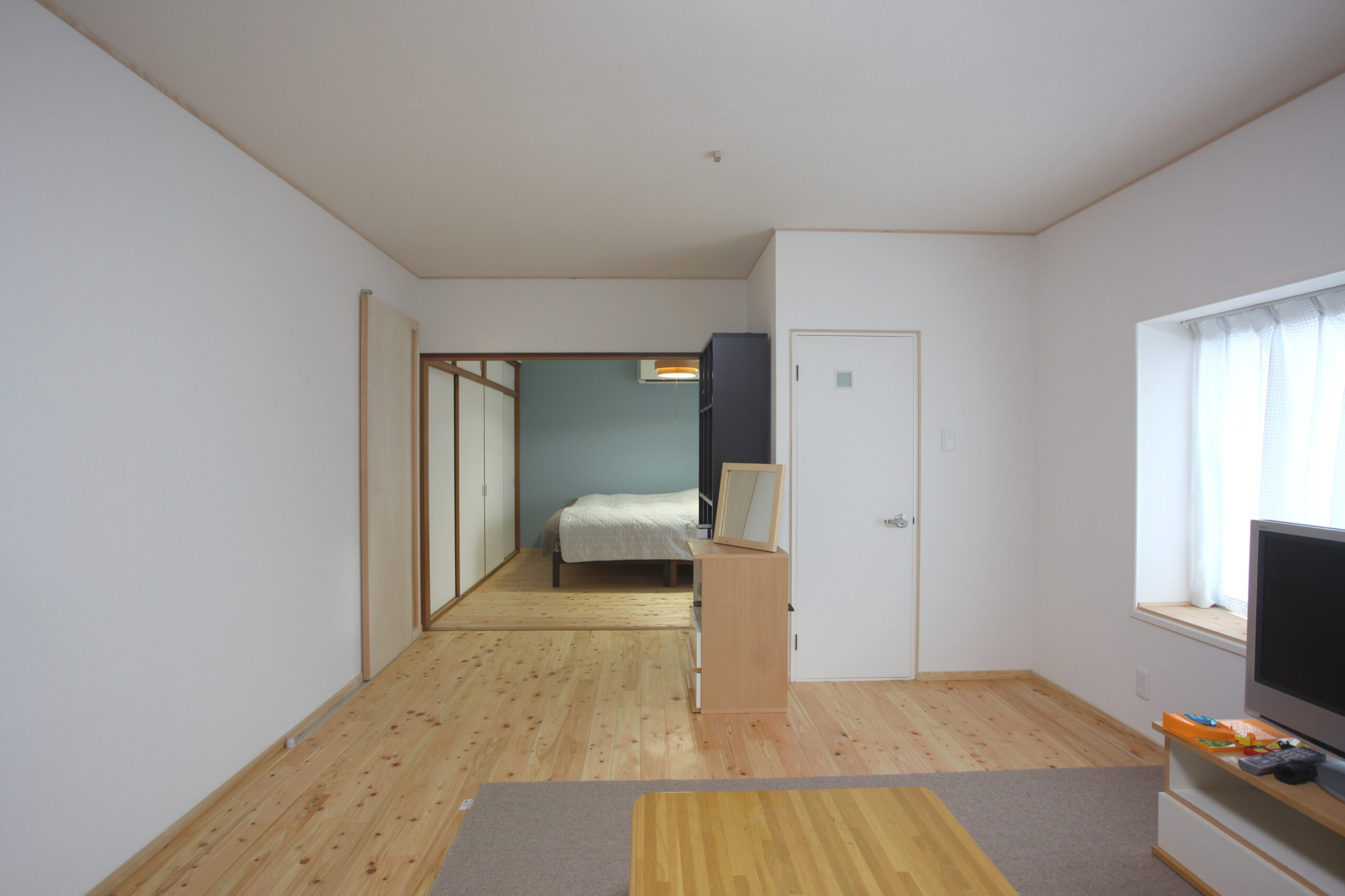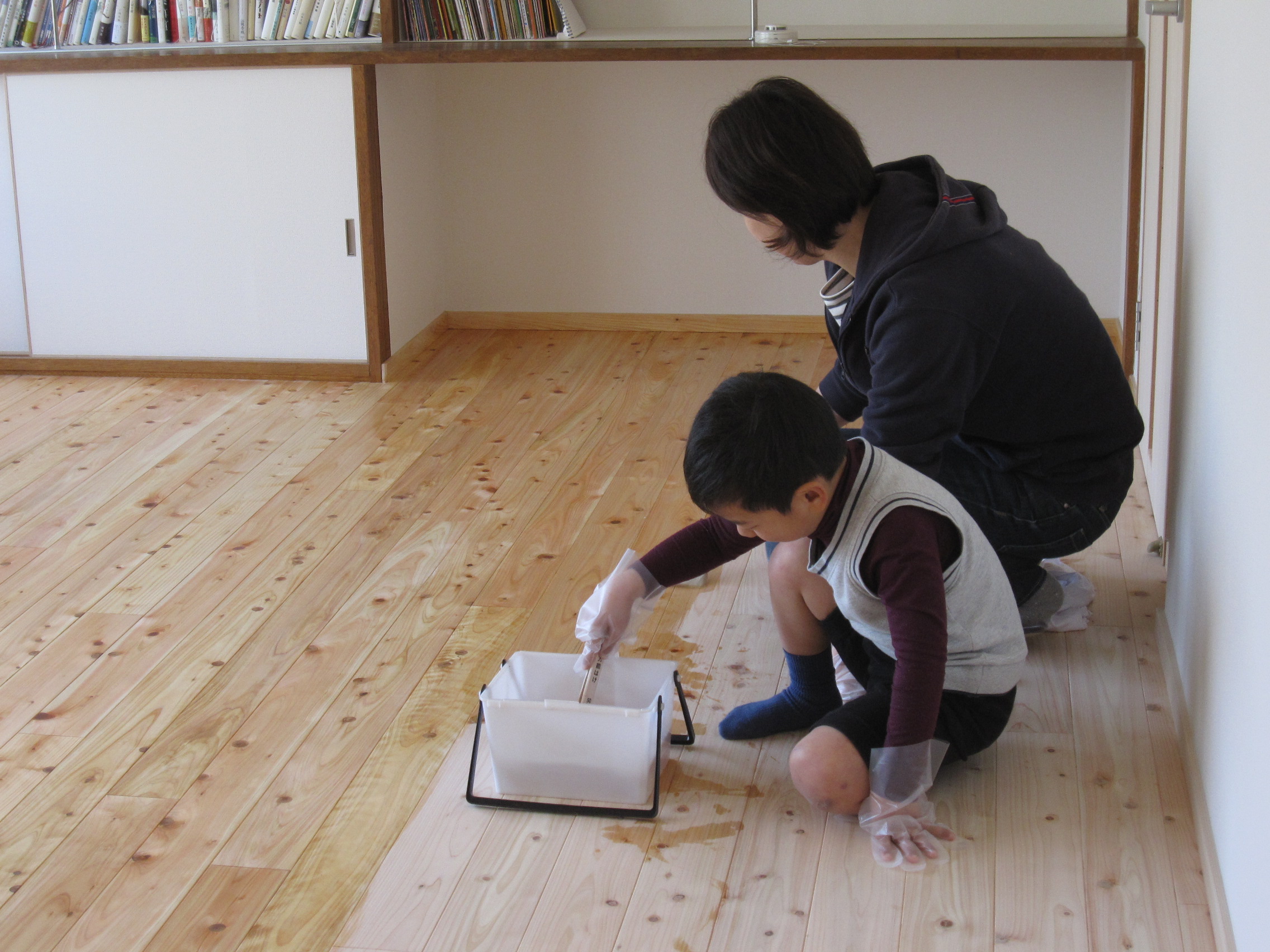 ナラの床材と珪藻土塗りの壁と天井のインテリア。