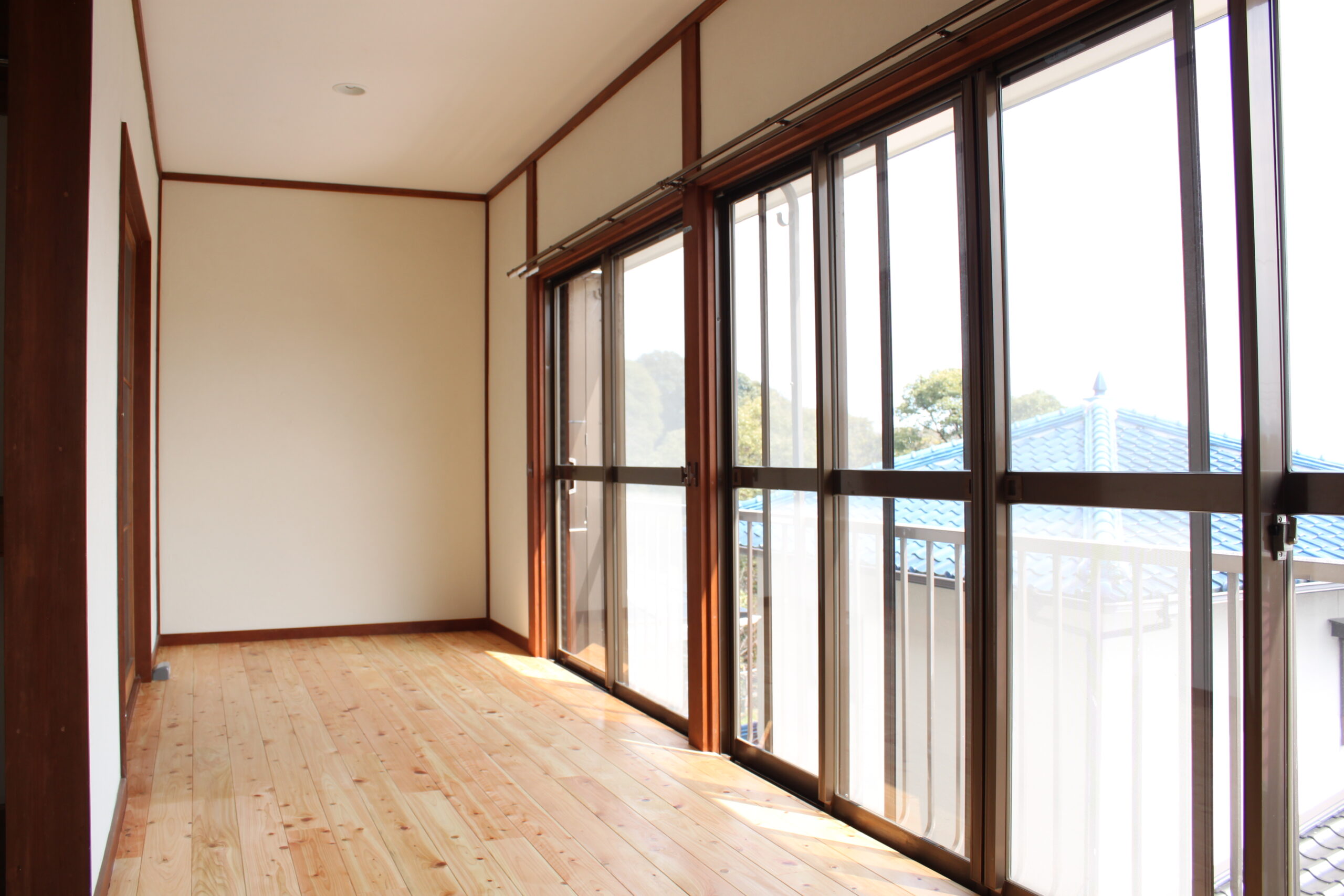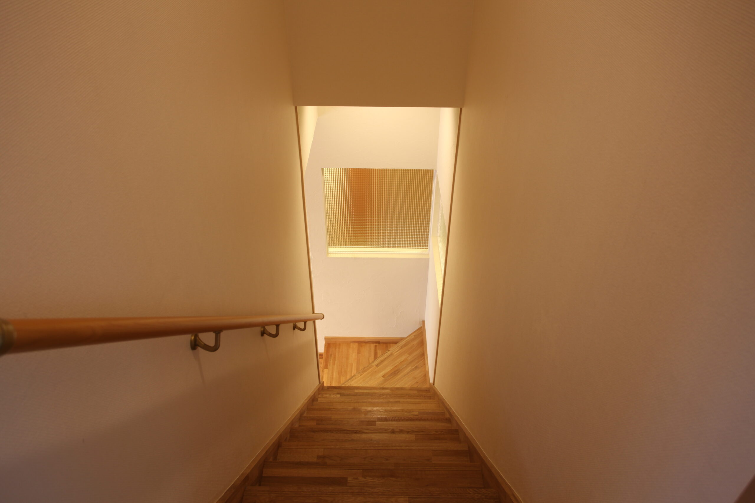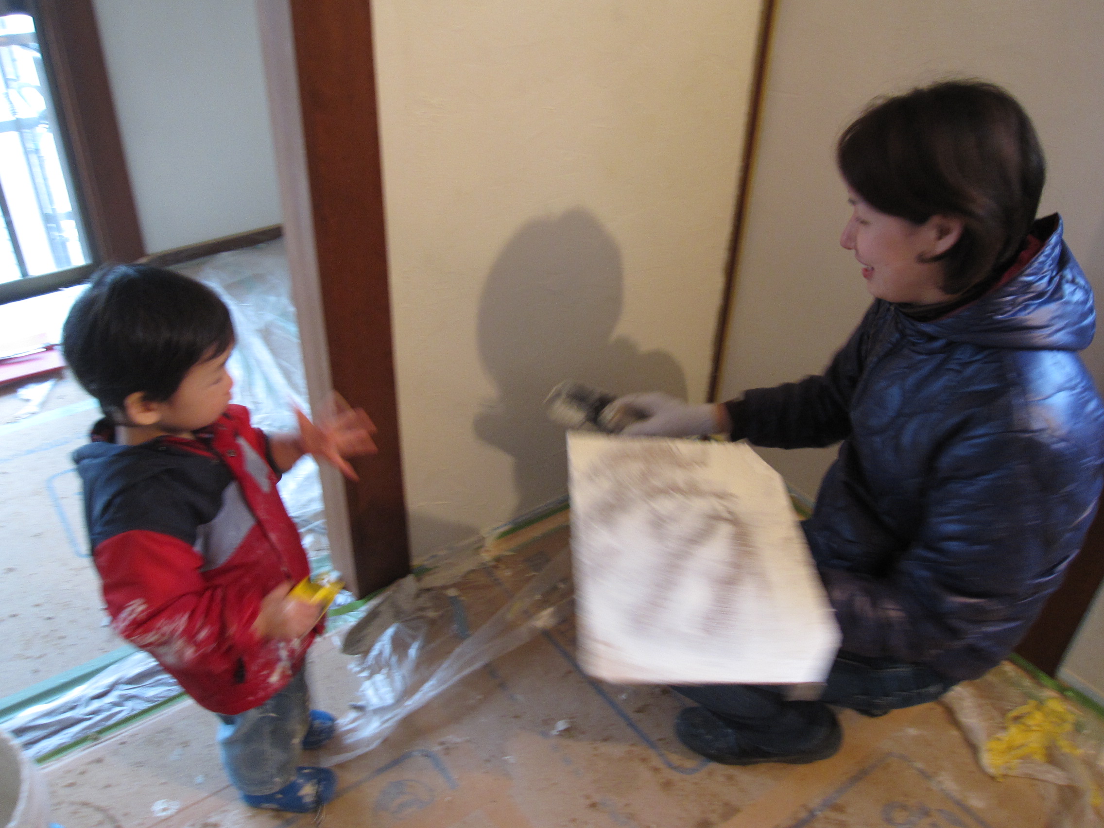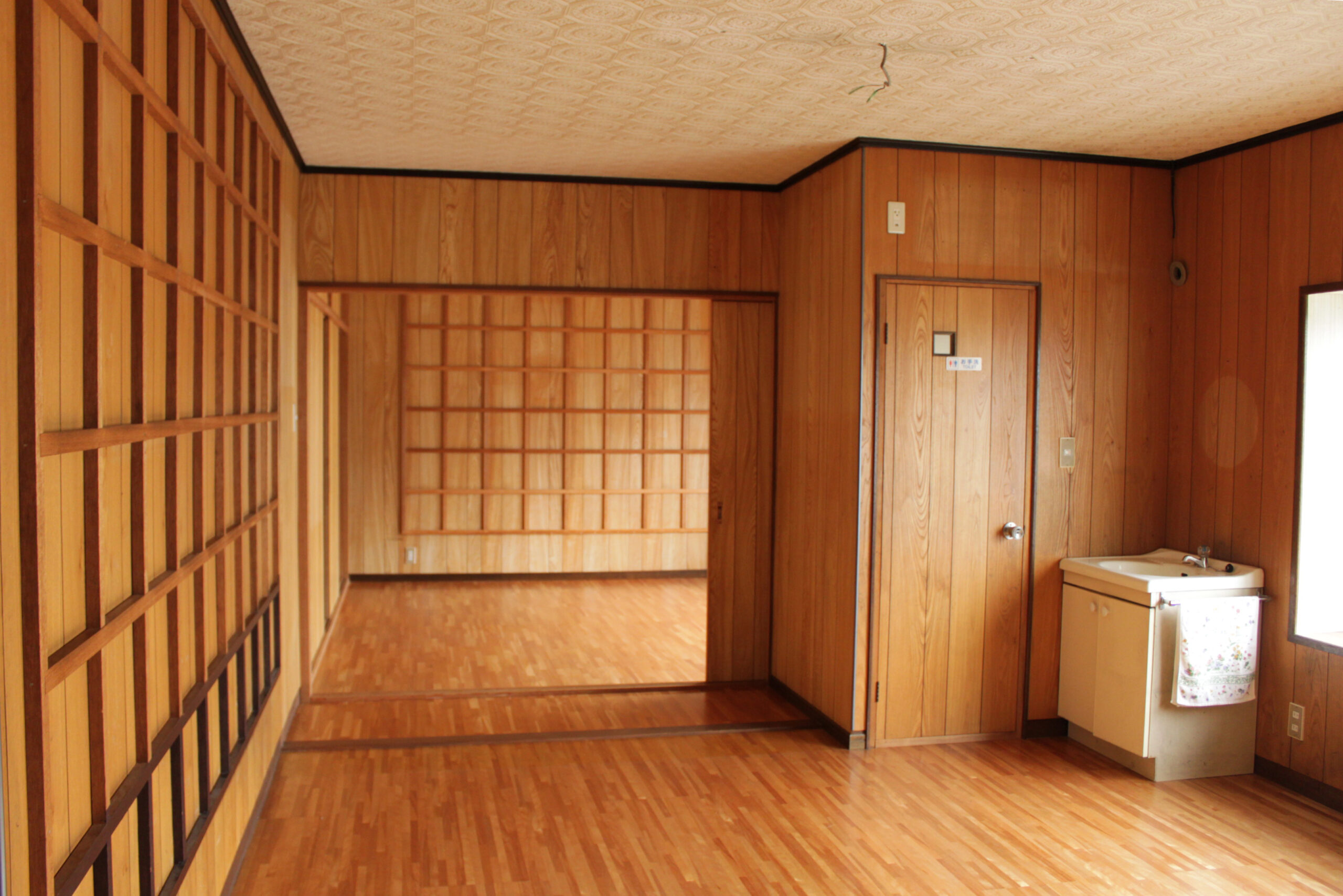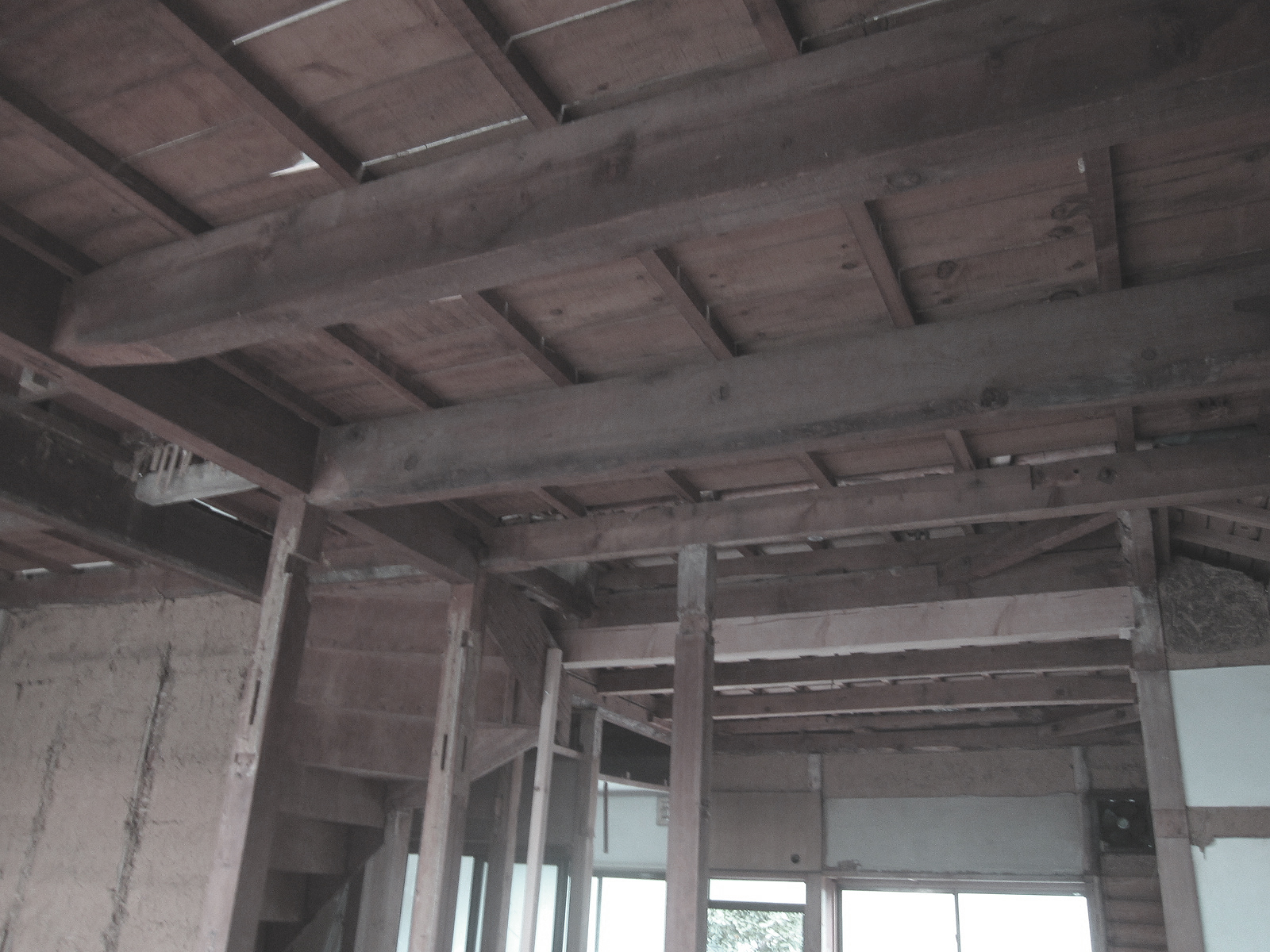 ナラの床材と珪藻土塗りの壁と天井のインテリア。