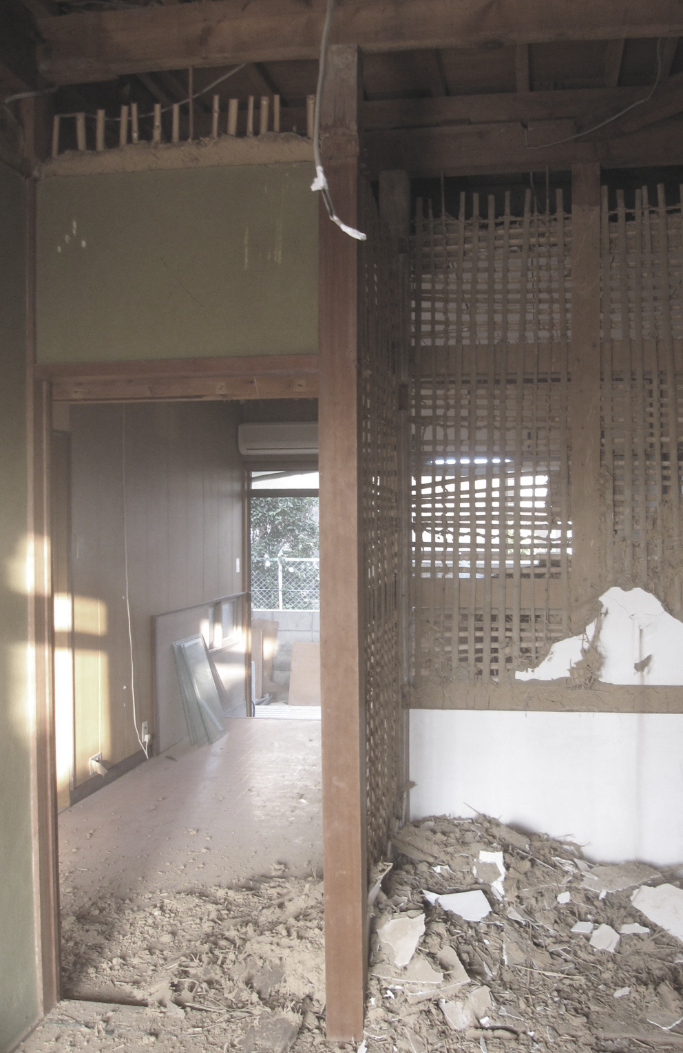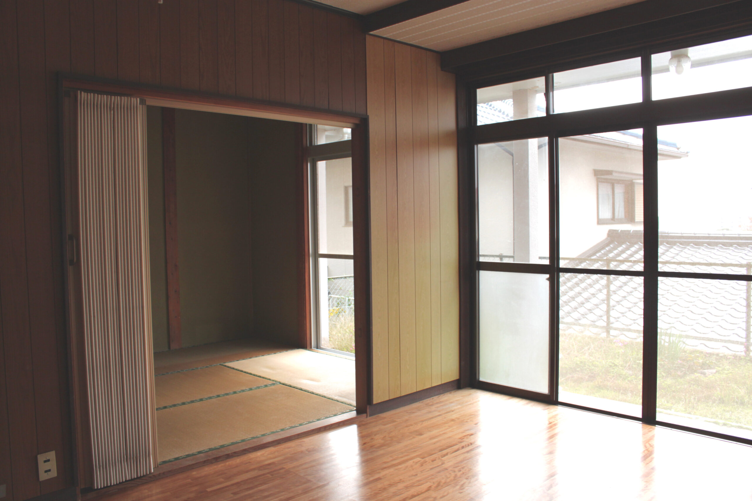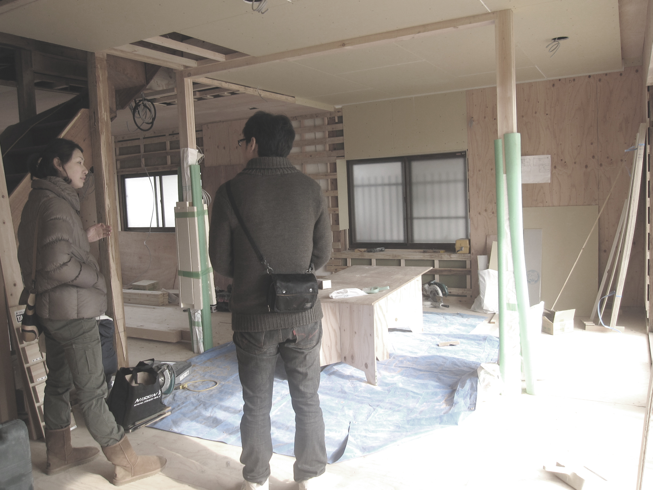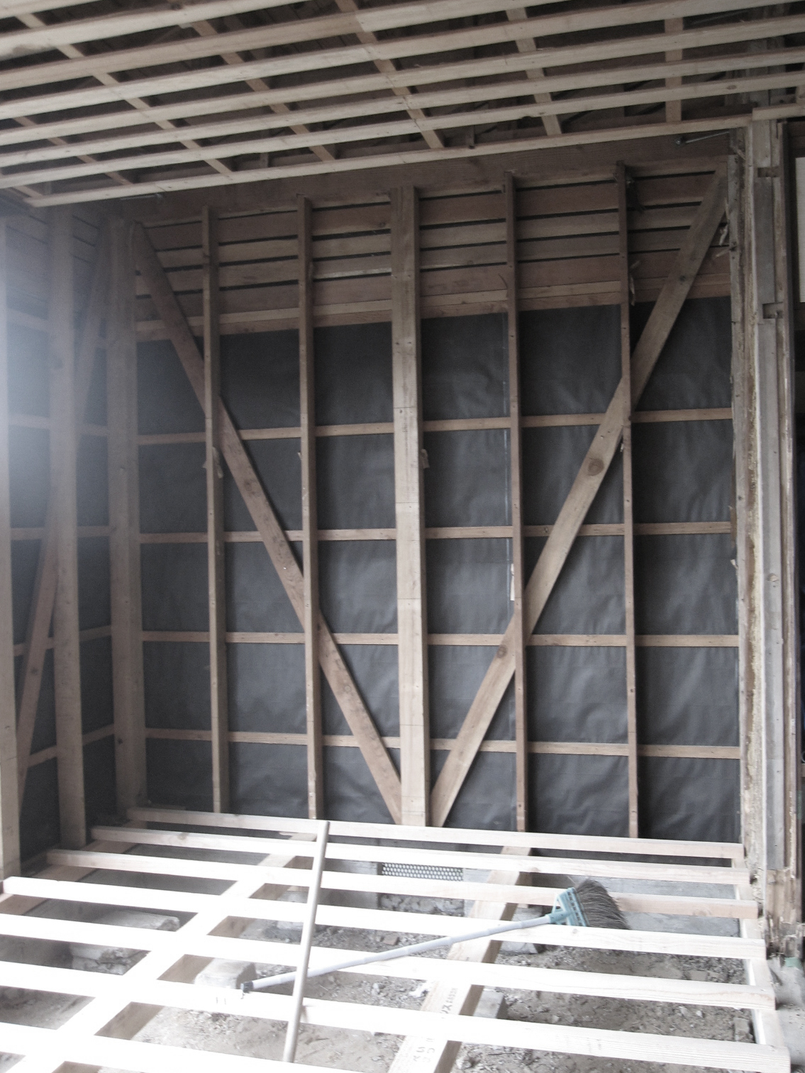 ナラの床材と珪藻土塗りの壁と天井のインテリア。