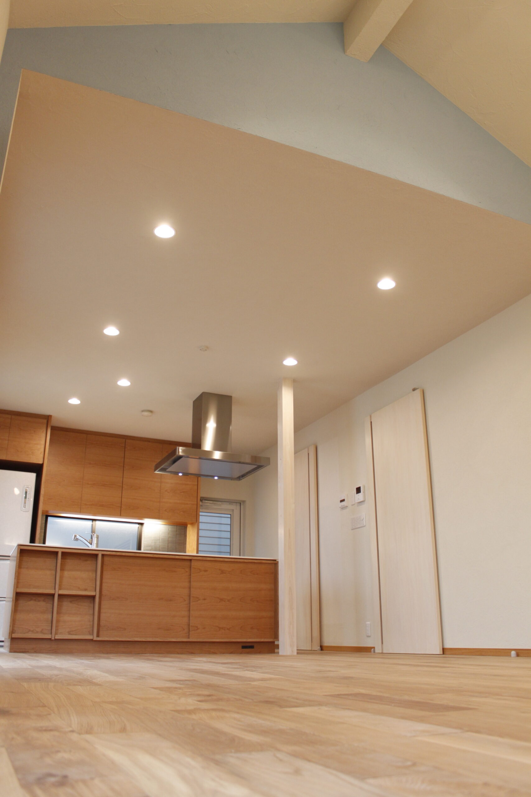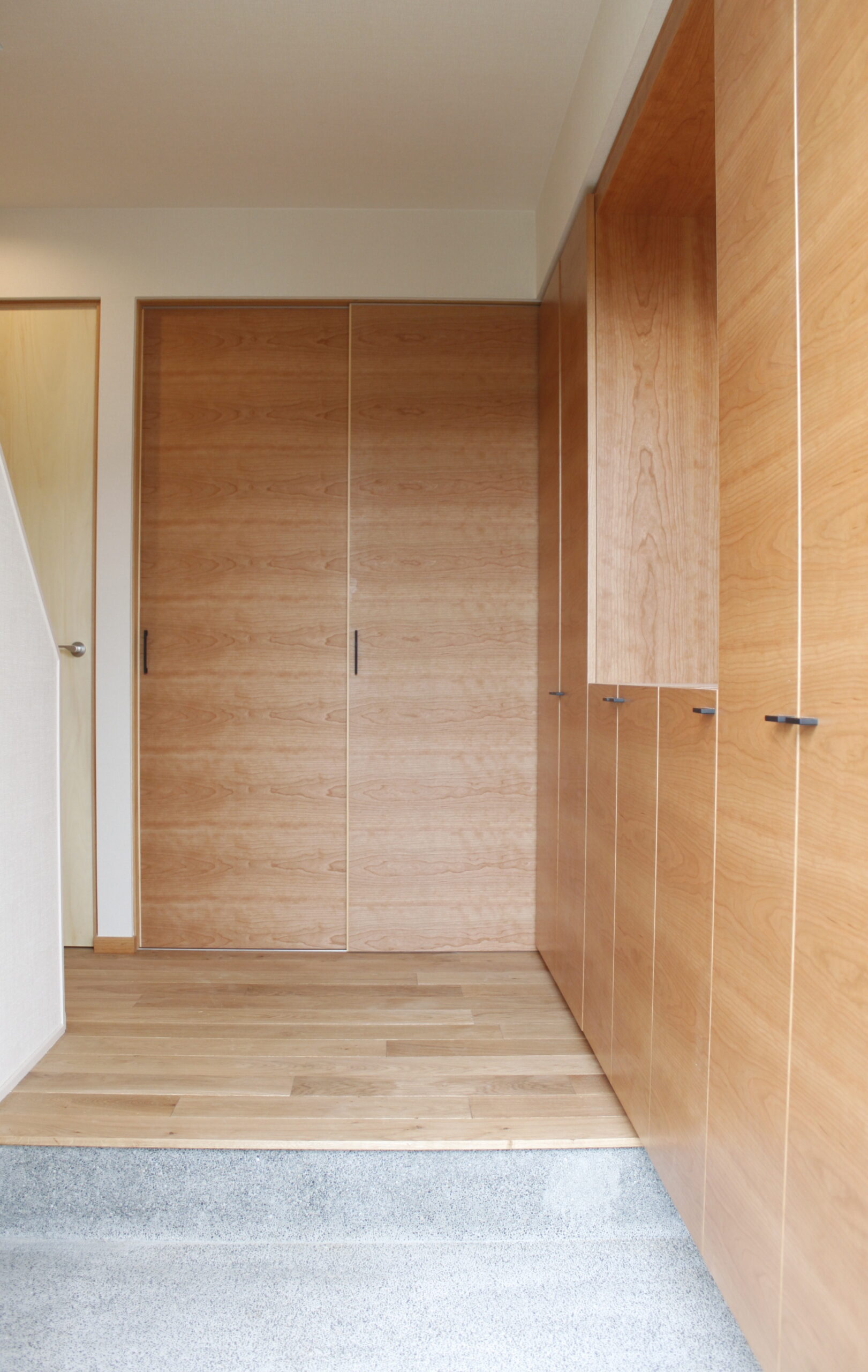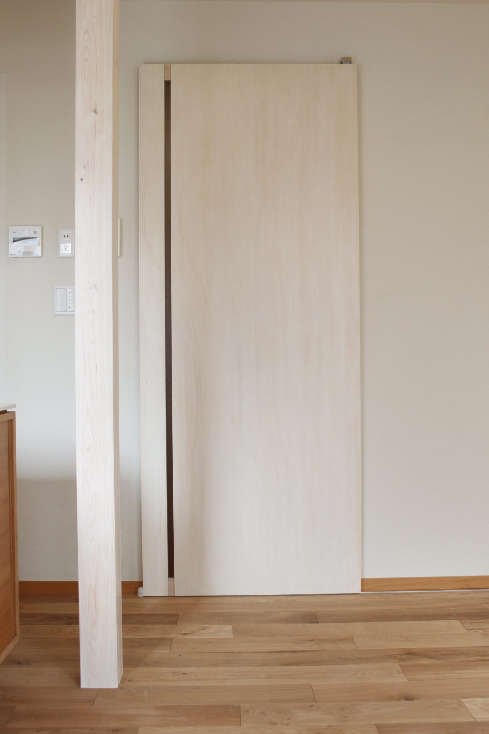木製建具の内窓とナラの床材、珪藻土塗りの壁と天井のインテリア。