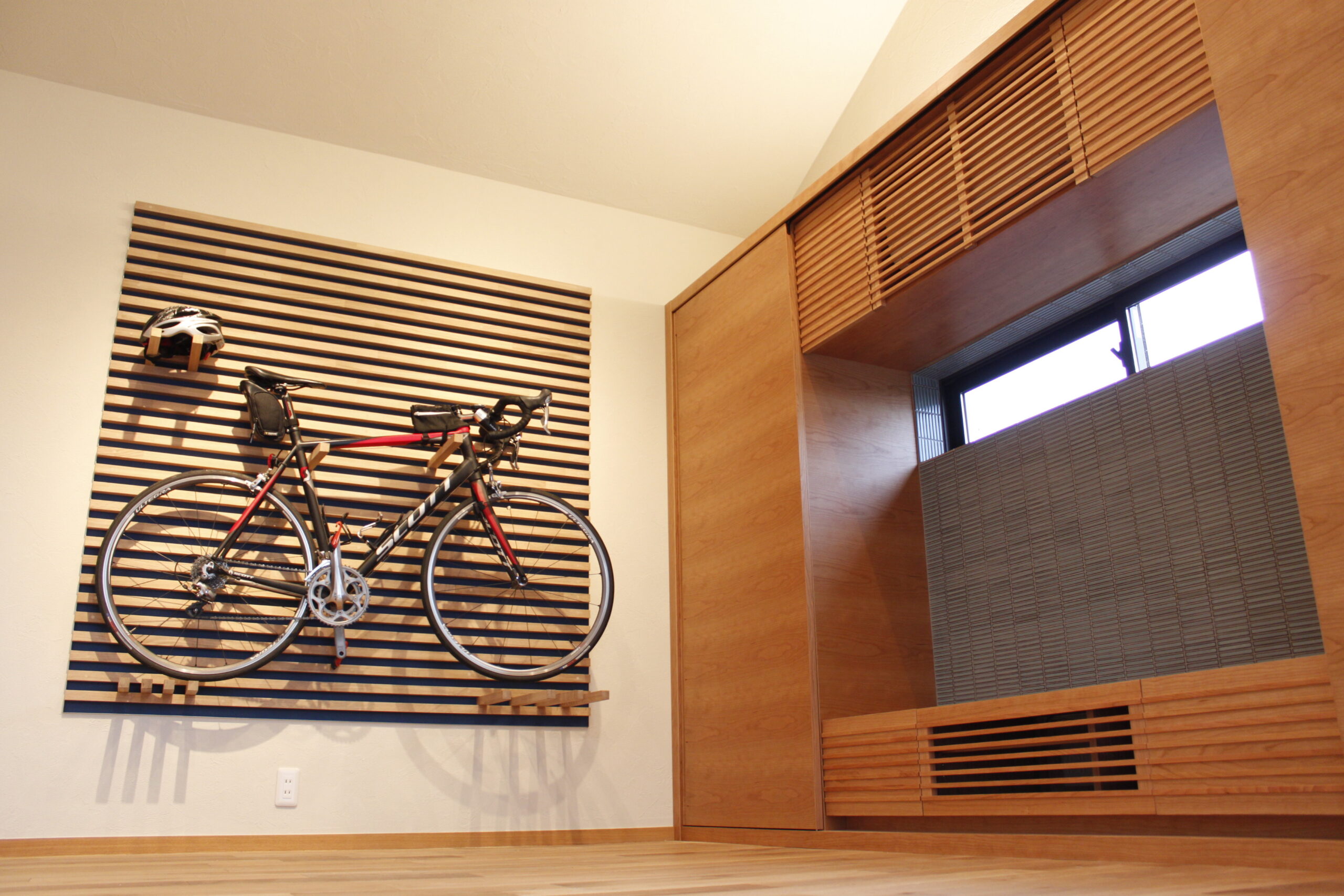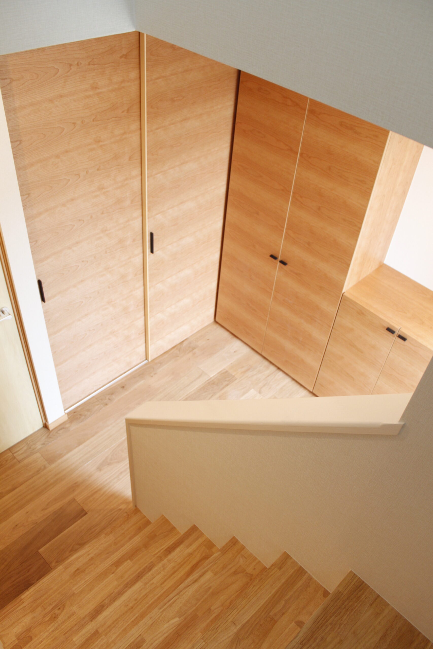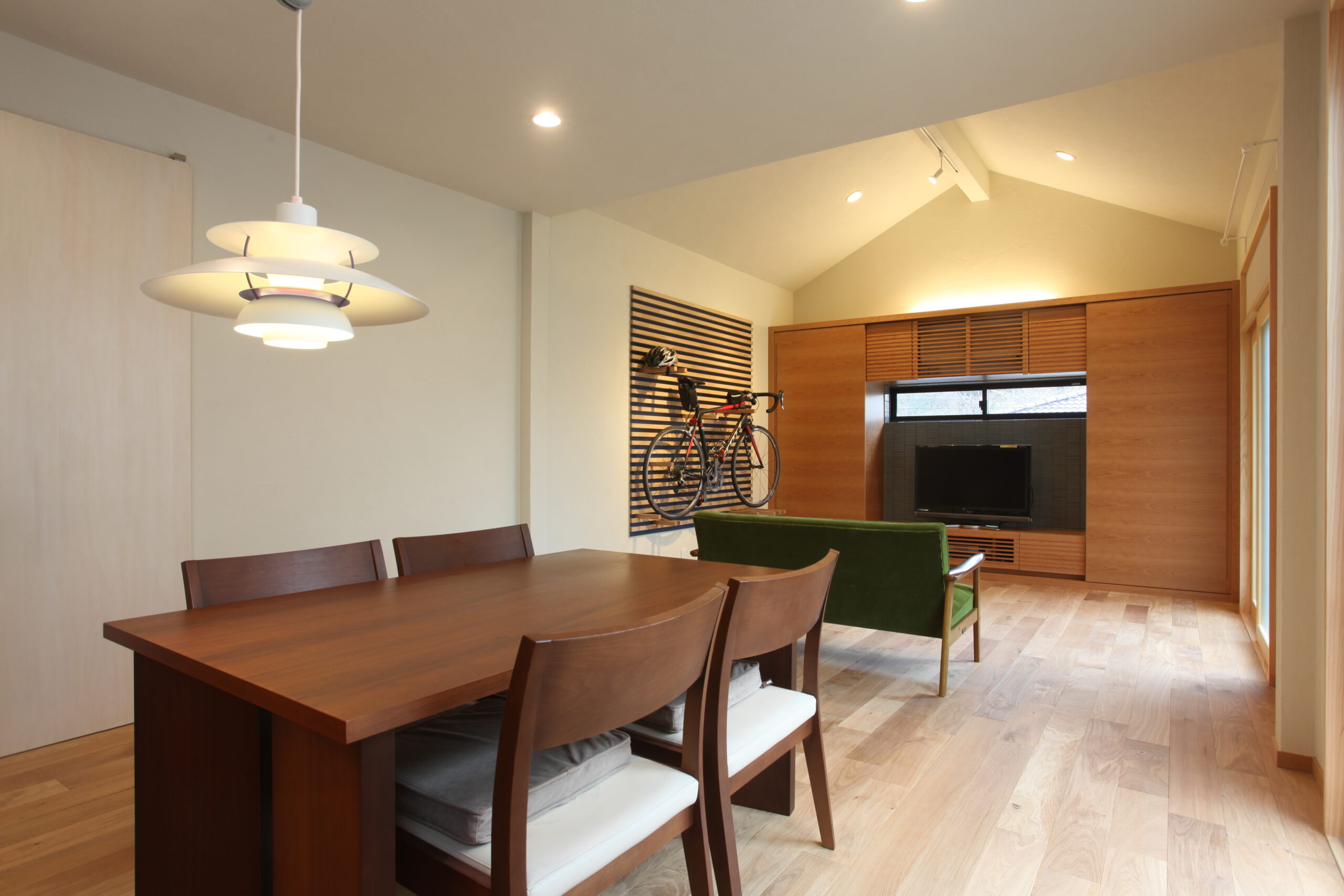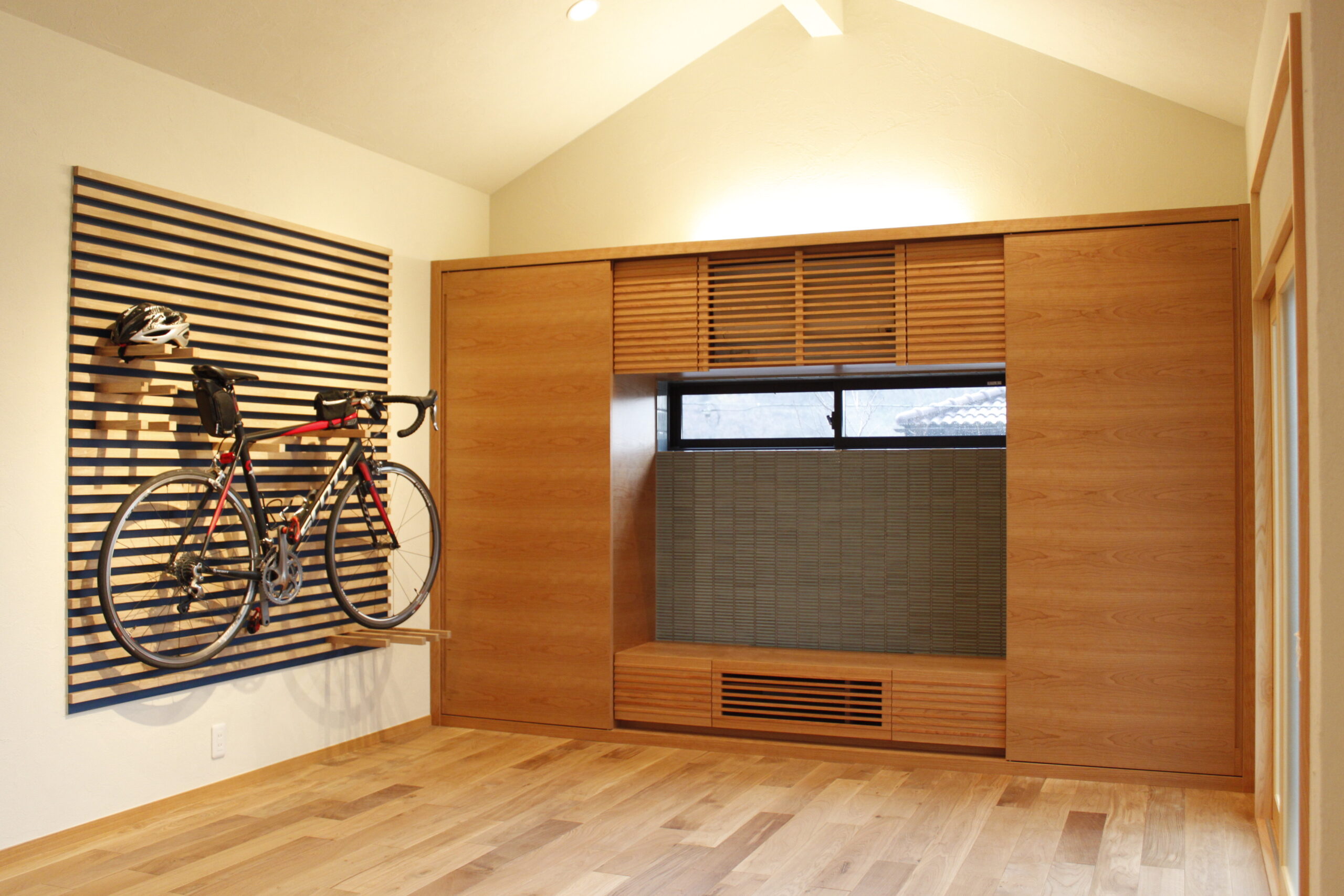 木製建具の内窓とナラの床材、珪藻土塗りの壁と天井のインテリア。